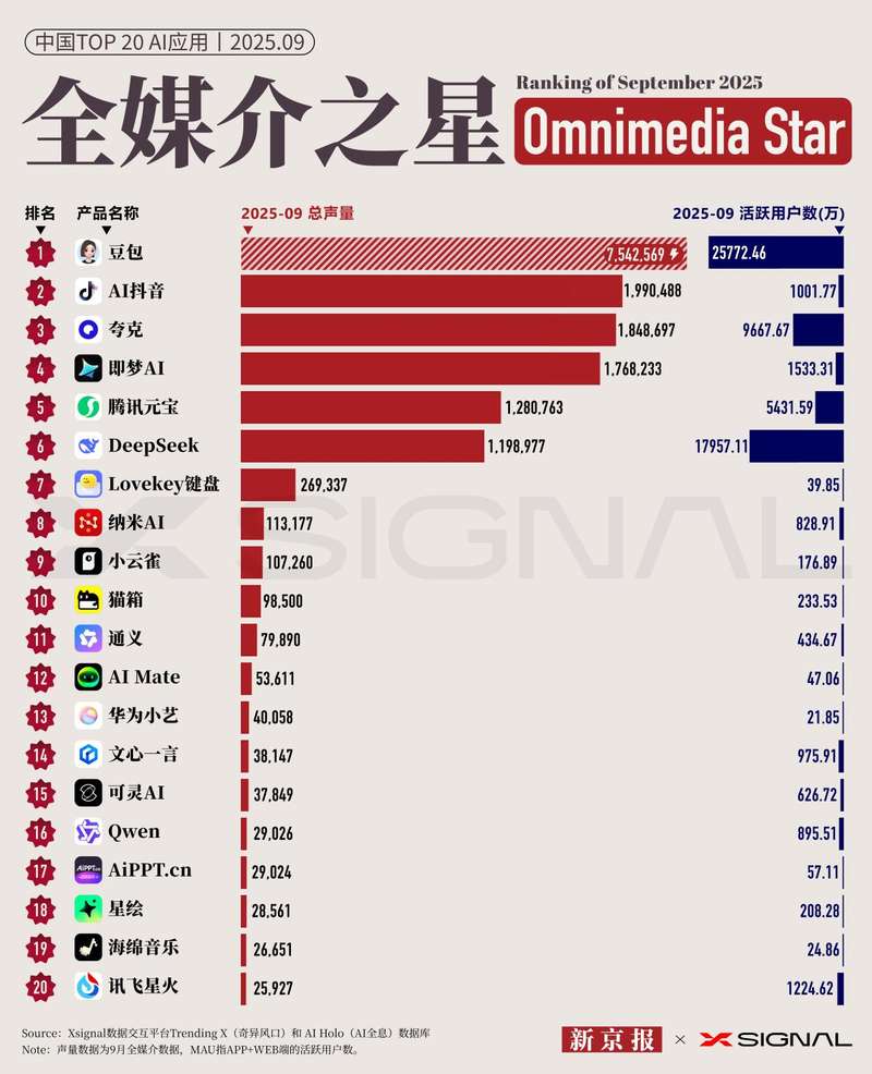 - 2025-10-26新京报联合Xsignal发布9月“全媒介之星”中国AI应用榜